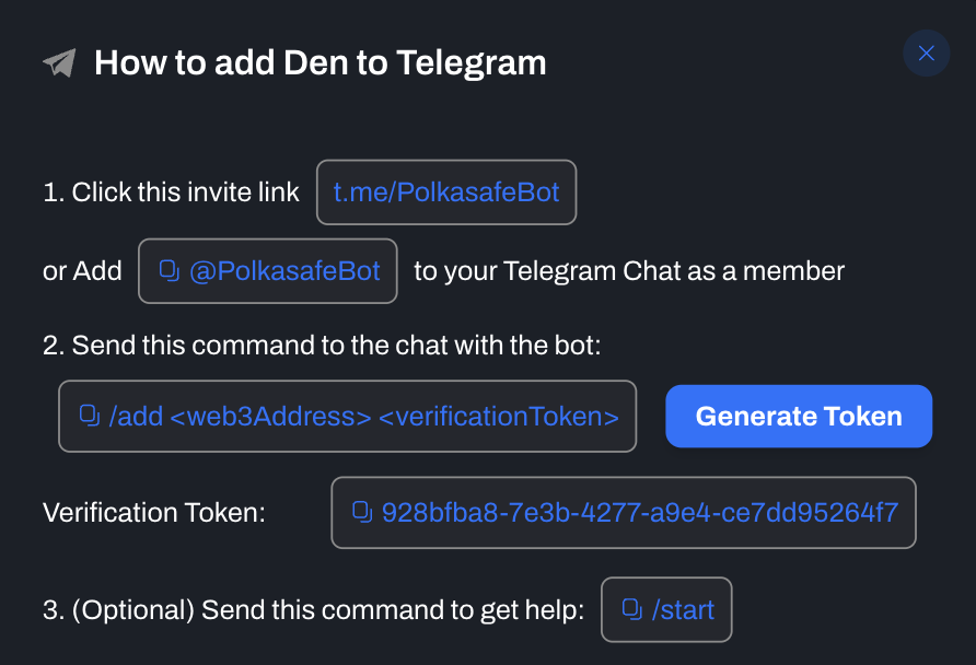 Telegram notifications can be enabled by adding the PolkaSafe's telegram bot to your multisig/team's telegram group with all signatories.&#x20;