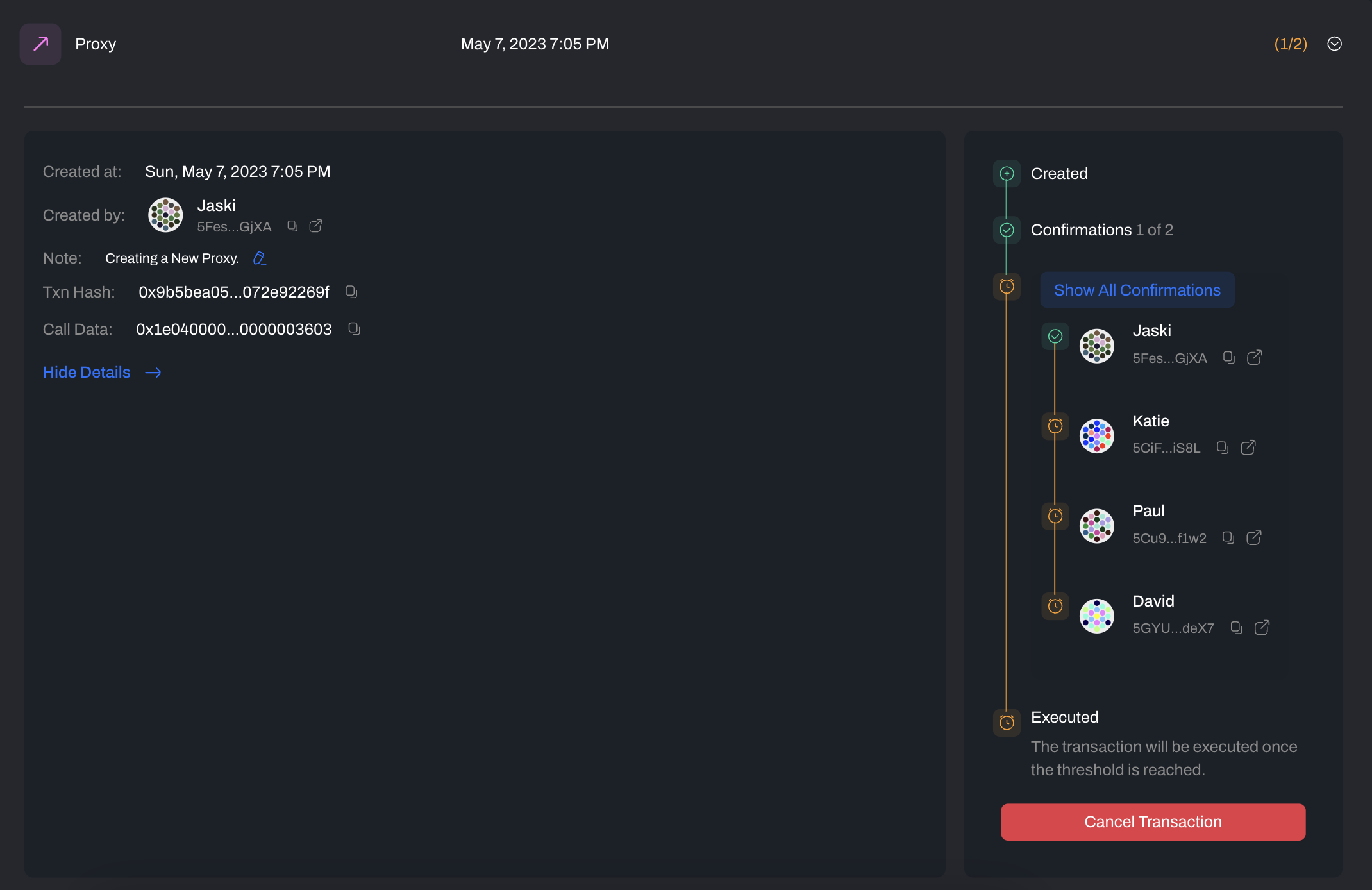 The transaction summary shows a brief description of the transaction, the date and time for creation of the transaction and (1/2) means that 1 signatory has signed the transaction and 2 is the threshold for approval.